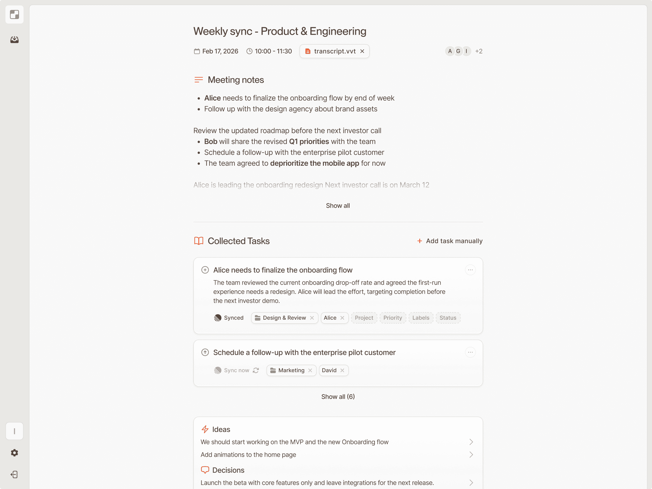 We remember your decisions, keep your ideas alive and tasks up to date. Giving your team clarity, to execute faster and make better choices.