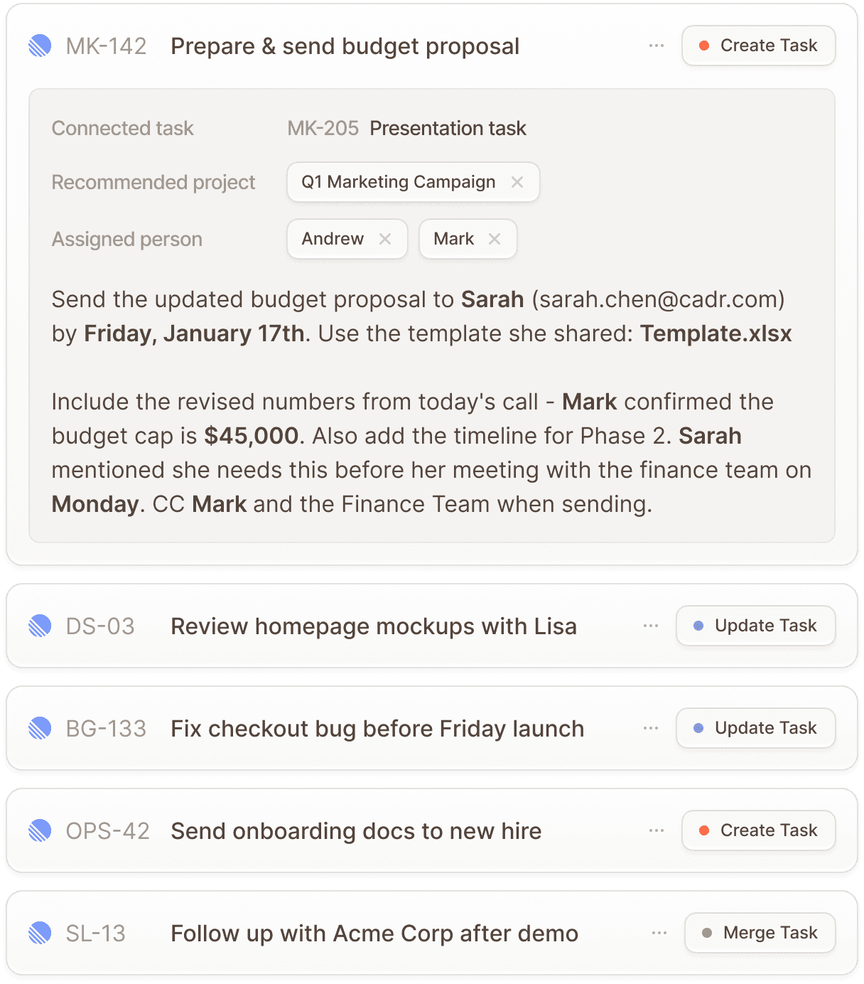 New tasks, updates to existing ones, and duplicates to merge - all with context.